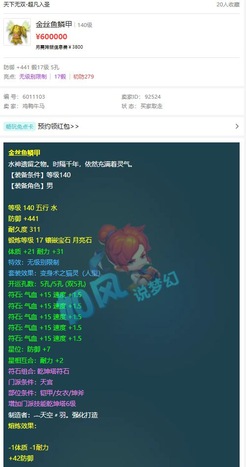 超凡入圣服务器的这件140无级别男衣服,熔炼加了42点防御,打了17段宝石后达到483防御,最终以60万的价格卖出去了。